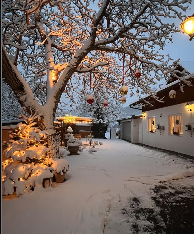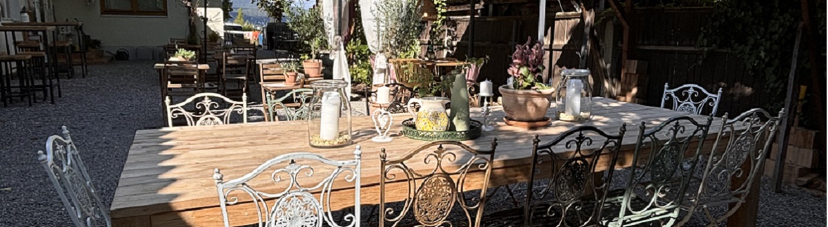 Im Sommer ladet unser Garten zum Verweilen und Genießen ein. Sei es an einem schattigen Plätzchen unterm Nussbaum oder eine für eine gesellige Gruppe an unserem schönen „Toskana-Tisch“ – für jeden etwas dabei.